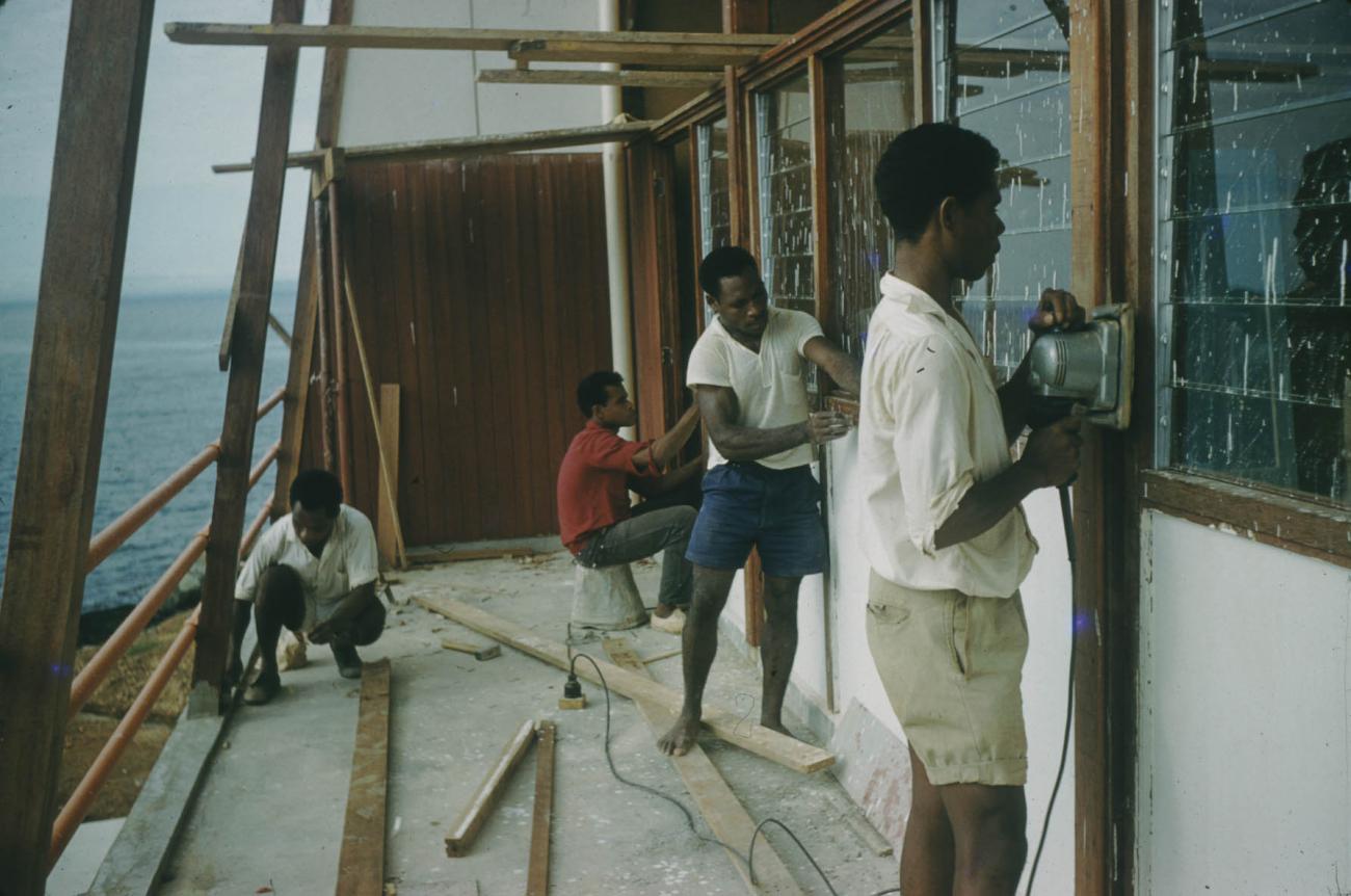 Koloniale nederzetting - Vier bouwvakkers bezig op balkon van appartement