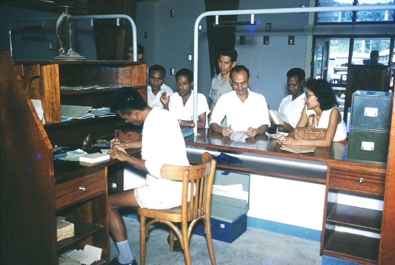 Postverwerking - Mensen wachtend aan balie terwijl bediende briefje schrijft