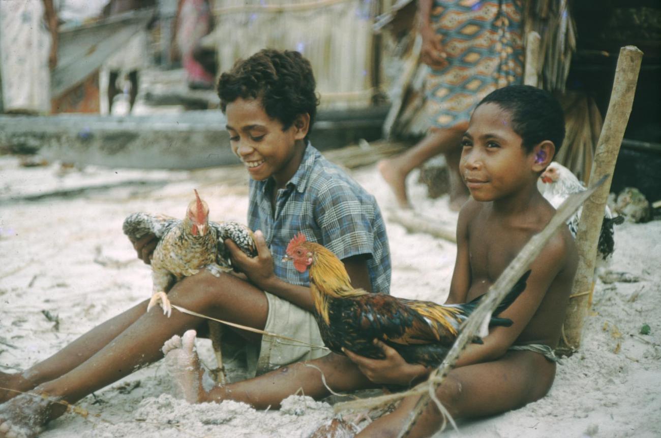 Vissersdorp - Twee zittende kinderen met levende kippen in hun hand