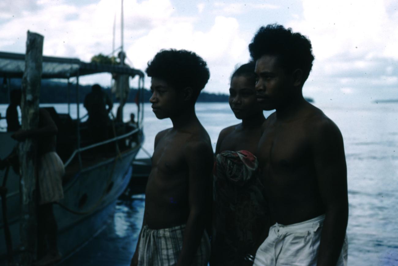 Visvangst - Twee mannen en een vrouw staan bij vissersboot