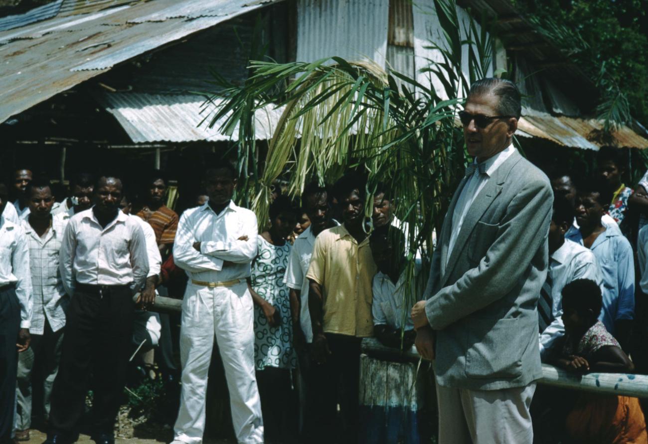 Verkiezingen Nieuw Guinea Raad - Kiezers luisteren naar toezichthouder bij de verkiezingen