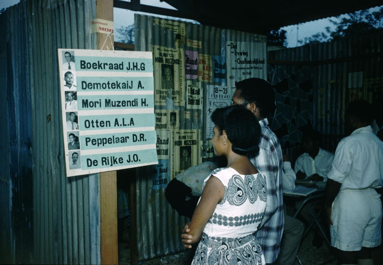 Verkiezingen Nieuw Guinea Raad - Vrouw en man kijken naar lijst met namen en foto's van kandidaten op bord bij een stembureau
