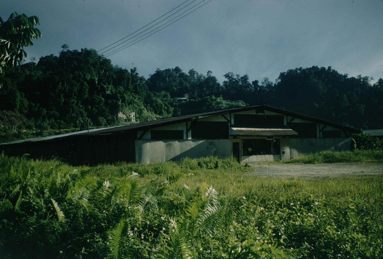 Drukkerij Pengantara - Gebouw van Pengantara ( het nieuwsblad voor nederlands nieuw guinea) onder ontvangstmasten in een bosachtige omgeving