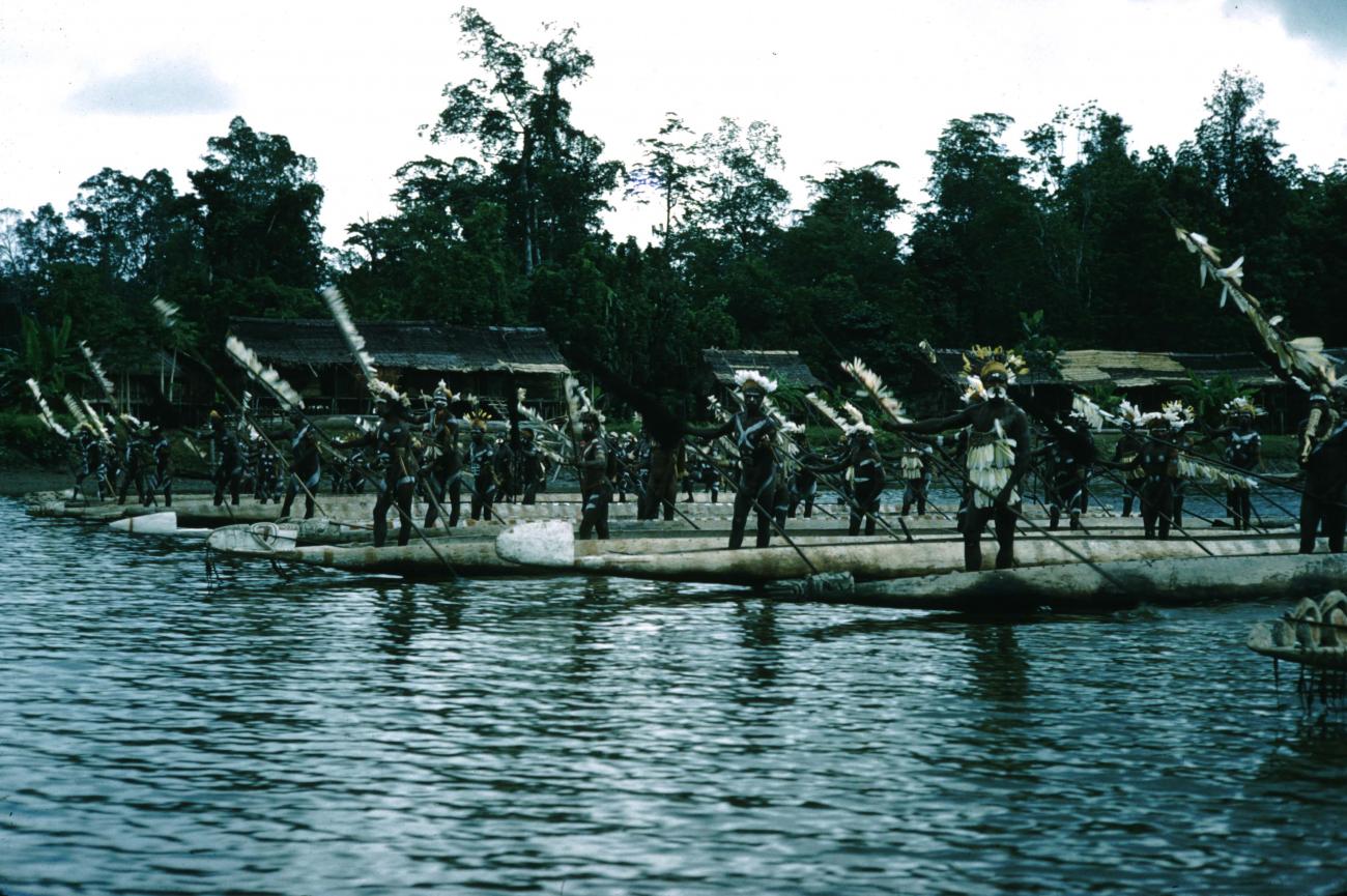 Nederzetting in waterrijk gebied - Wedstrijd van versierde Papoea's in prauwen met witte peddels/vaarstokken