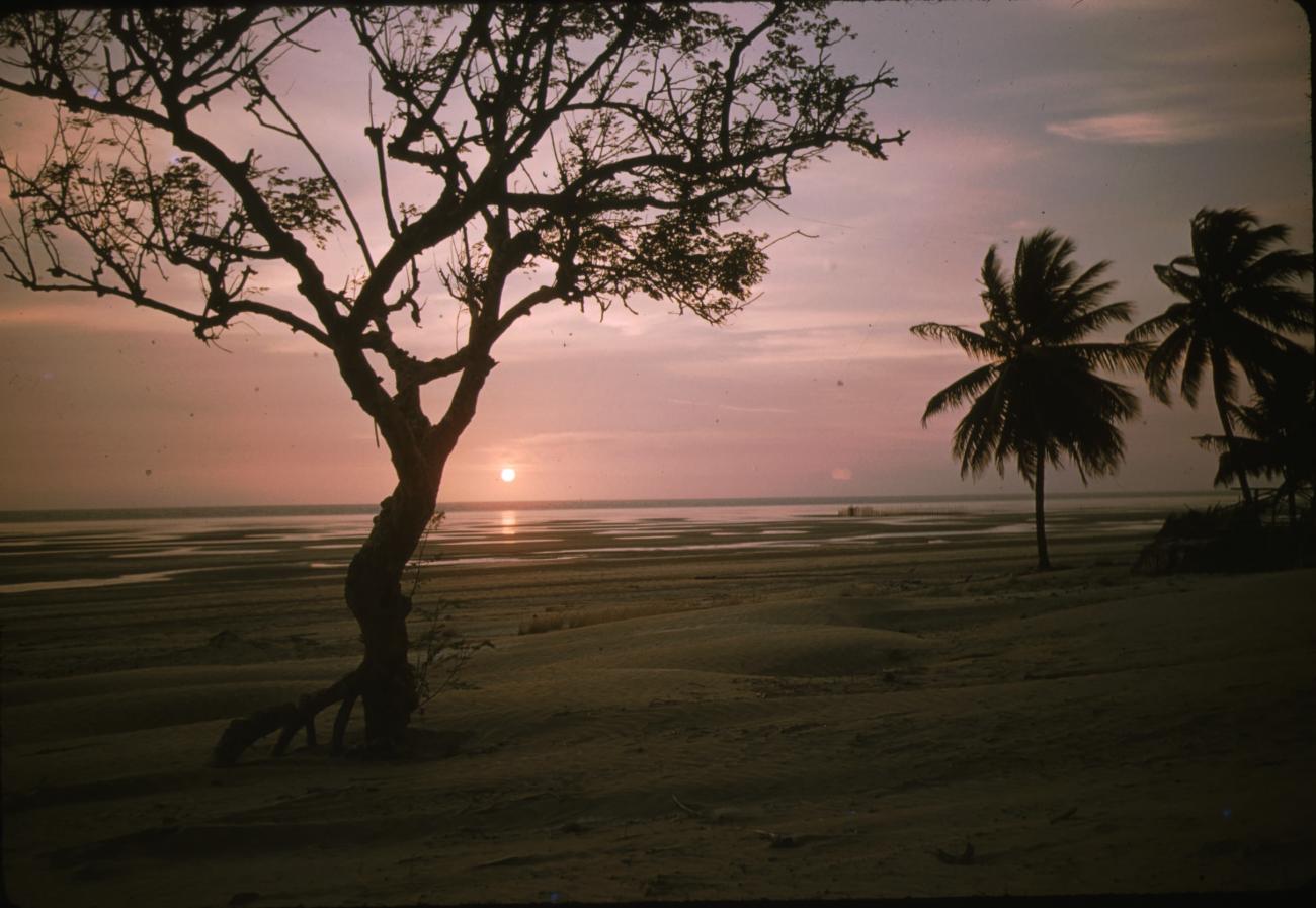Merauke - Ondergaande zon aan palmenstrand met solitaire loofboom