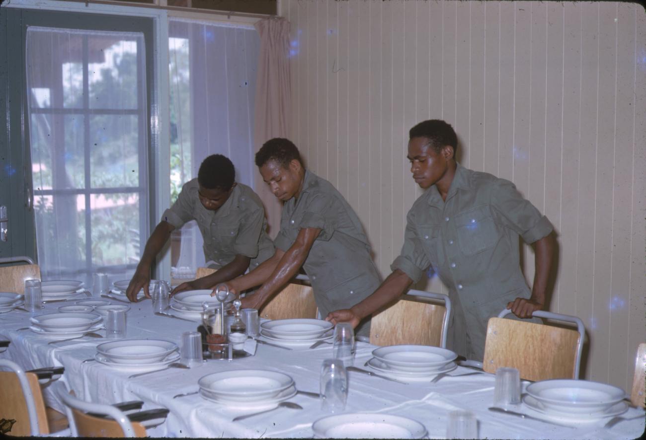 Opleidingskamp Papoea Vrijwilligers Korps te Manokwari - Drie man Papoea-personeel bezig met dekken van tafel