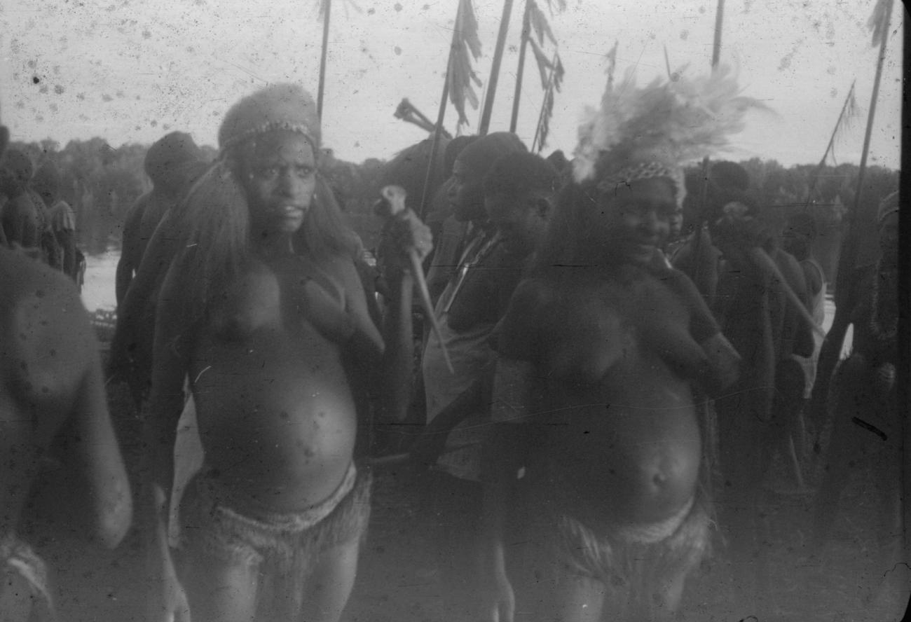 Twee vrouwen uit de Asmat met hoofdtooi en casuarisbot als dolk