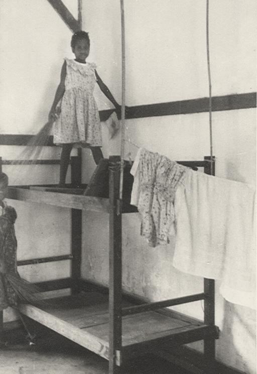 Papoea- kinderen die het slaapvertrek schoonmaken