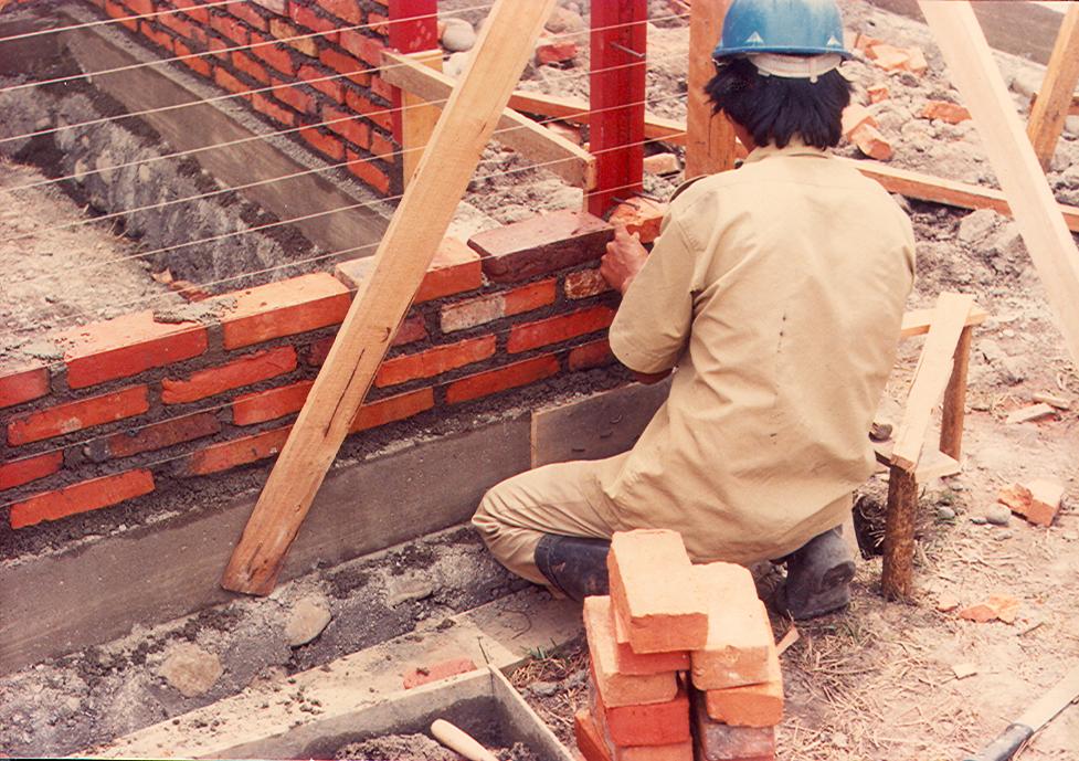 Bouwvakker metselt een muur van het medisch centrum in Wamena