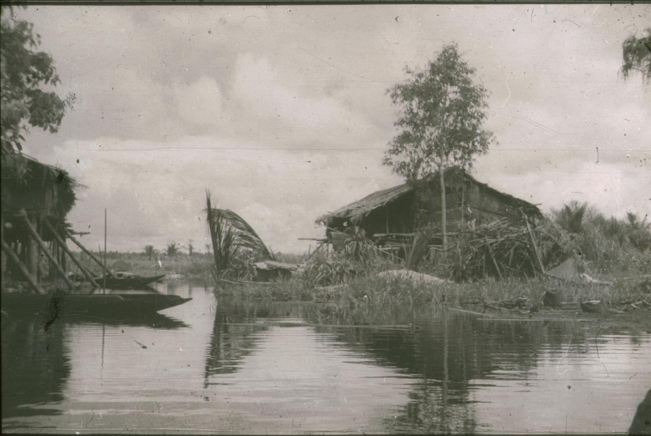 Landschap met rivier en prauwen en op de oever paalwoningen