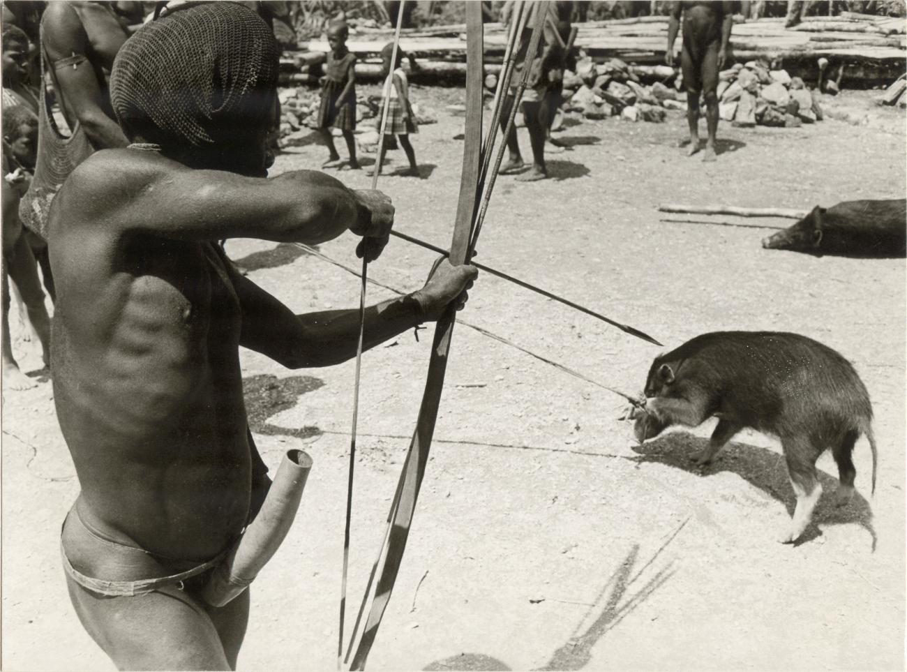 Een varken wordt gepijld voor bereiding in de smoorkuil (onder de stenen op de achtergrond)