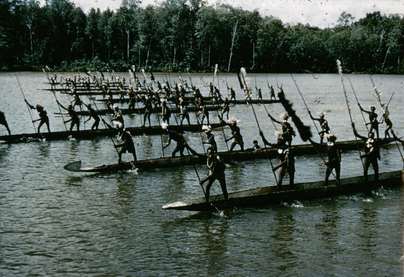 Asmat, rivier, prauw, hoofdversiering, speer, neusversiering, hoofdversiering