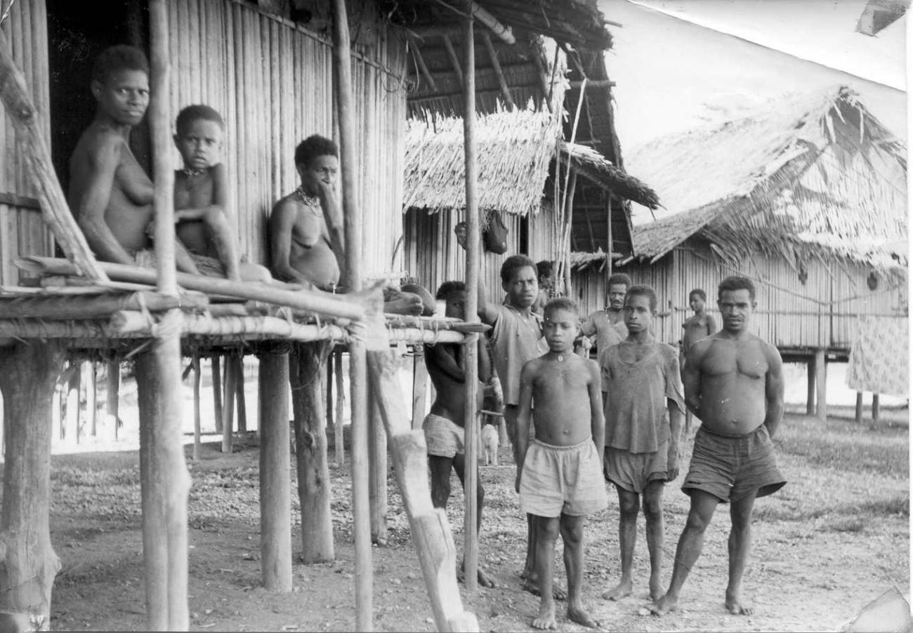 Bewoners van dorp in Zuid Nieuw Guinea