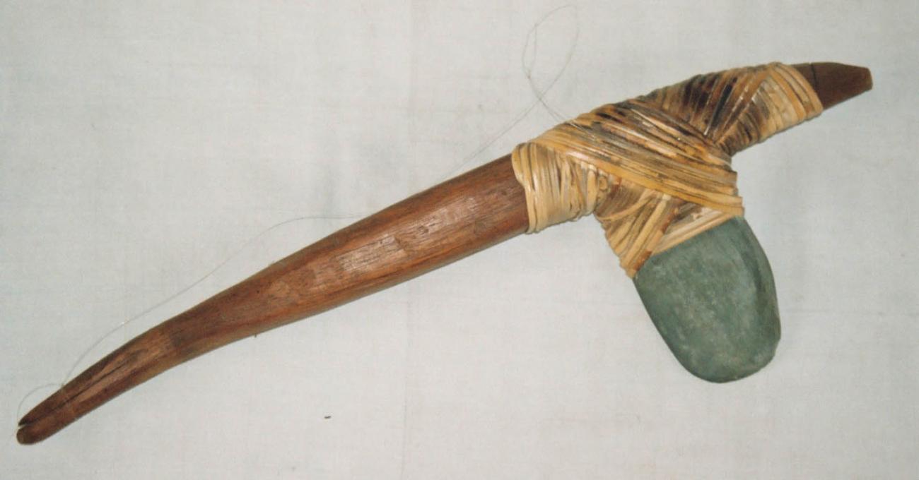 Een kleine bijl met korte steel. De kling is vervaardigd uit groene steen.