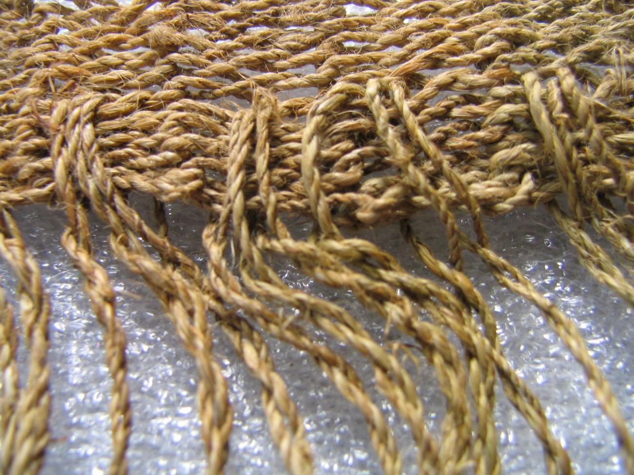 De rand (2 cm) en draagband zijn apart van de grote vorm gemaakt en later zijn die aan elkaar gezet met een siersteek die bestaat uit een lange verbindingslus waarvan de twee draden tussen de rand en de grote vorm 8 tot 10 keer om elkaar zijn gedraaid. De grote vorm is in zandloperlussen (figure eight looping) die verschillen van grootte. Er is waarschijnlijk niet met een maatreep gewerkt. Er is onderaan om een hulpdraad begonnen en in het rond gewerkt tot de gewenste lengte. De onderkant is dichtgemaakt met een sierlussteek. De rand en band zijn ook in zandloperlussen en volgens een bijzonder patroon gevormd. Waarschijnlijk is het midden van de draagband het begin.