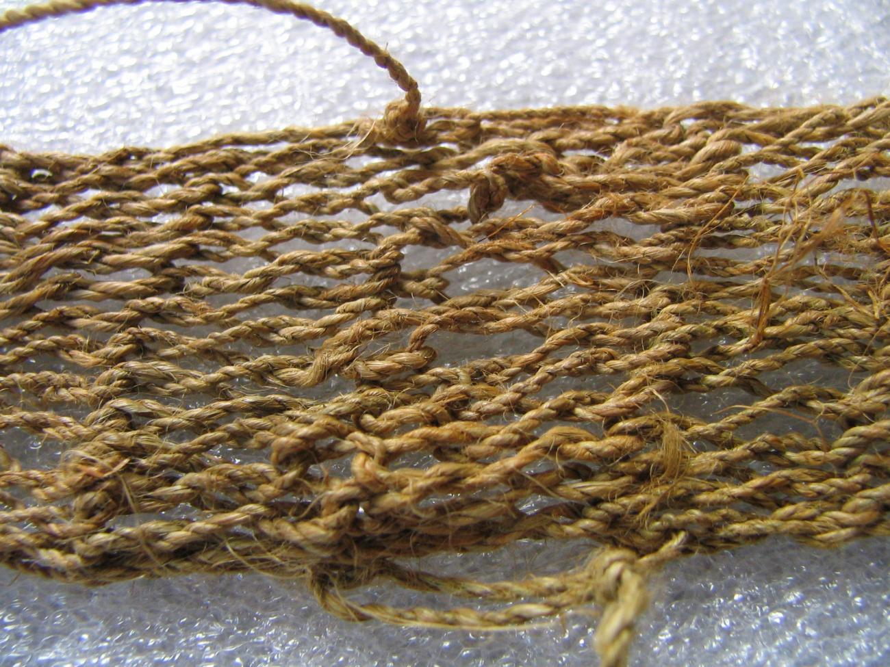 Een groot draagnet met een sierrand. De trapeziumvorm met onderaan een punt is zowel ontstaan door gebruik als door de constructie van de draagband, maar is in opzet rechthoekig. De bovenzijde is open en er is een draagband van 31 cm lang en 3,5 cm breed. De grote vcrm is in luswerk, net als de rand en de band. De verbinding tussen rand en grote vorm is een ajour siersteek in groepjes van drie. Er is een willekeurig kleurpatroon door gebruik van verschillende tinten bastvezel, op enkele plekken waarschijnlijk groen aangeverfd (die kleur is verbleekt). Het is een net voor het vervoer van oogst, hout, dieren en kinderen. Het net wordt met de band over het hoofd gedragen. Door de constructie van de rand en de band, trekt het net dan boven wat dicht.