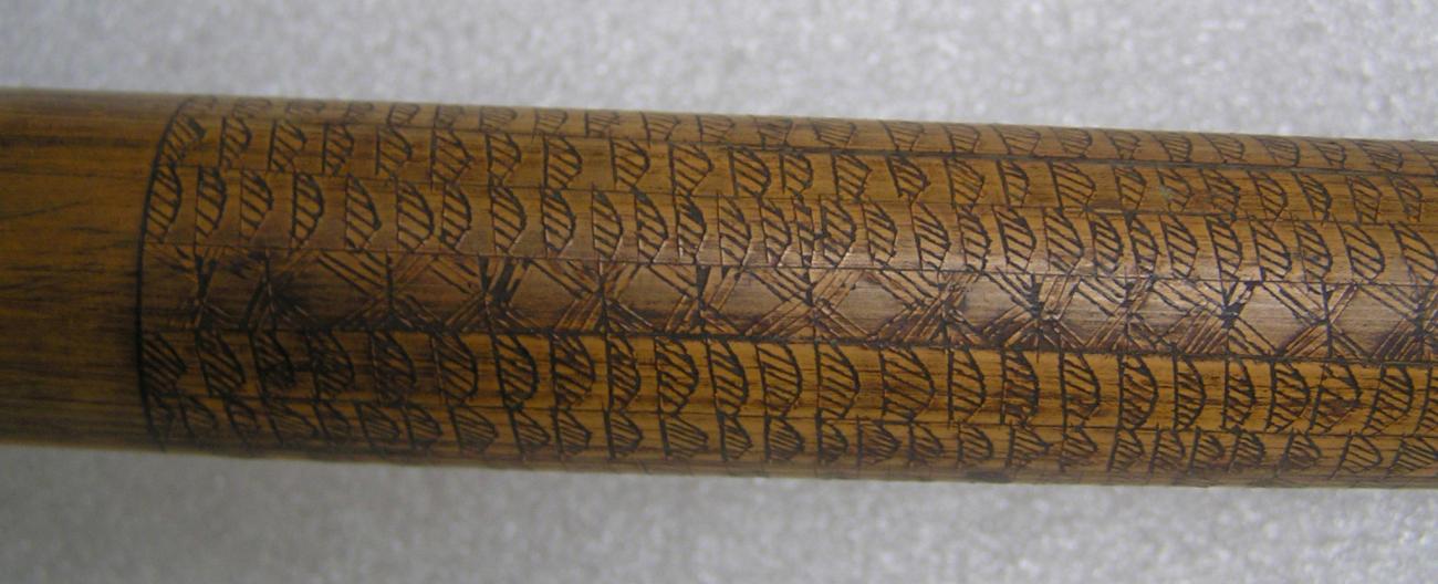 Jagerstrofee; een koker met casuarisbotten, rijk gedecoreerd met abstracte motieven. De botjes zitten eigenlijk in de koker en steken er dan bovenuit - zie ook nr 25. Gebruik volgens G. Kaigere: attribuut / trots bewijs dat een succesvol jager bij zich draagt.