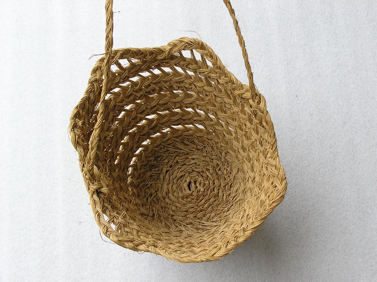 Gevlochten open tas met hengsel. De bovenkant heeft een golvend patroon