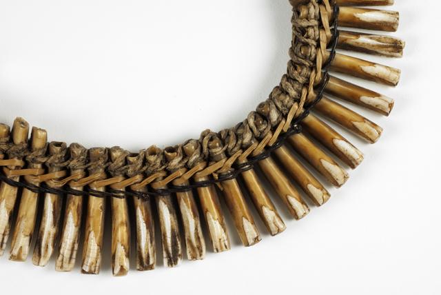 Tanden zijn aan elkaar geregen en gevlochten met touw en boombastvezel.