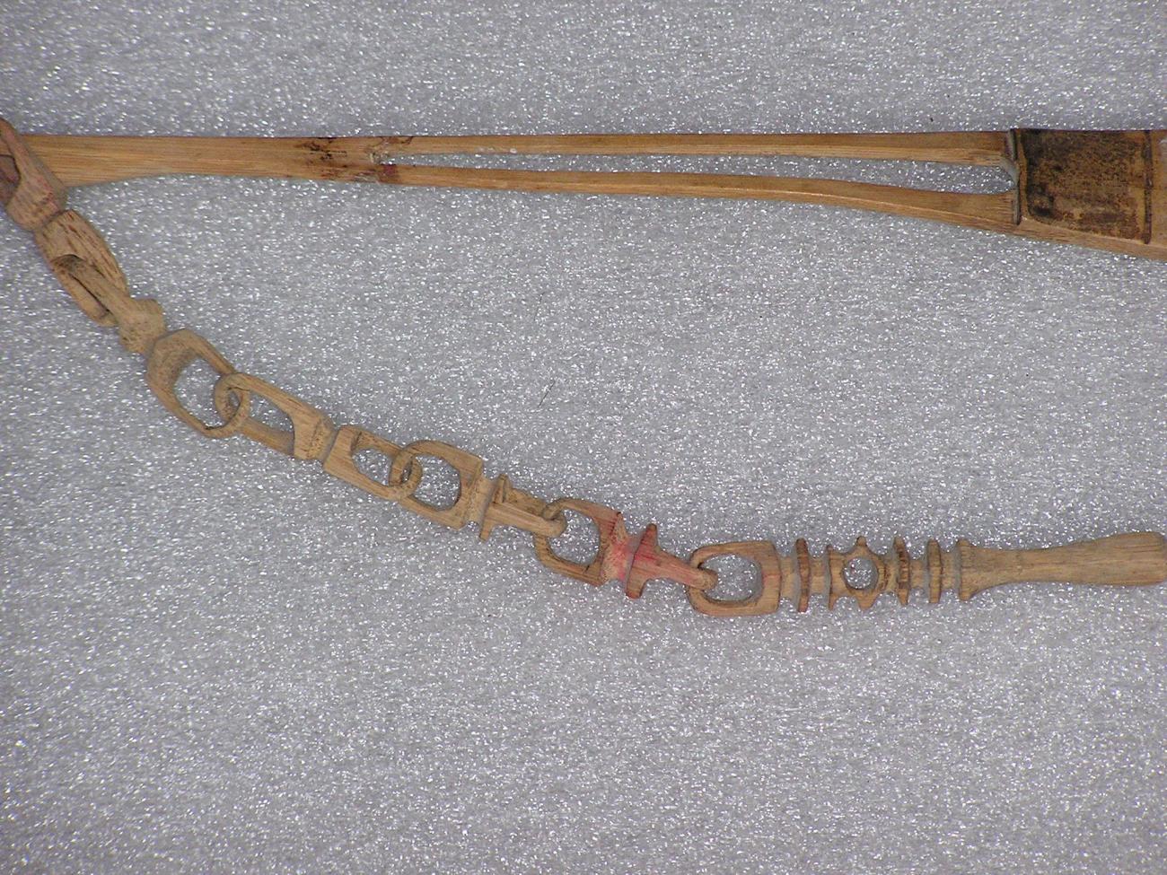 Bamboe kam of haarsierraad. De kam heeft zes tanden en een opengewerkte steel. Aan het eind van de steel is een soort schakelketting uitgesneden uit één stuk bamboe. De tanden zijn met wiggetjes en klei gespreid en met stukjes gekleurd bastvezel omwonden.