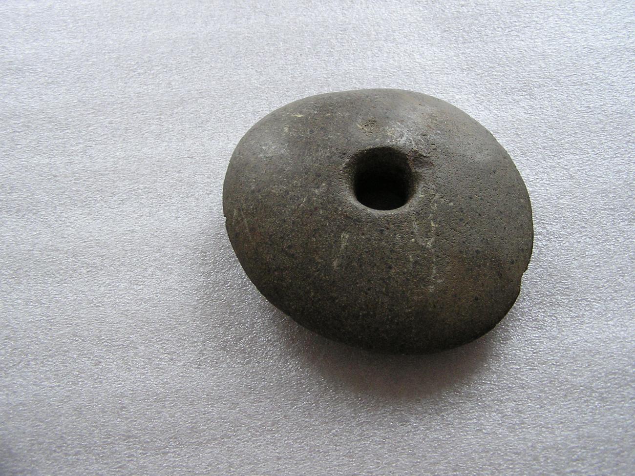 Ronde stenen knots. In het midden zit een gat waar de houder heeft gezeten. De steen is geslepen en gepolijst. Vanaf het gat voor de houder is de steen naar de buitenrand toe ' scherp' afgeslepen, zodat het als bijl gebruikt kan worden.