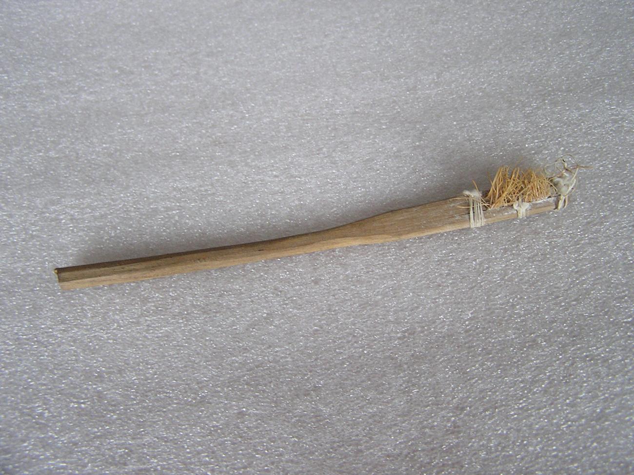 Houten tandenborstel. De borstel ziet er gebruikt uit. De borstel zelf is waarschijnlijk gemaakt van plantaardig vezel. Tussen de vezels zit waarschijnlijk tandpasta. De kop is twee keer anderhalve centimeter ingesneden. Daarin zijn vezels van de borstel gestoken. De kop is omwonden met draad, zodat de vezels in de inkepingen blijven zitten.