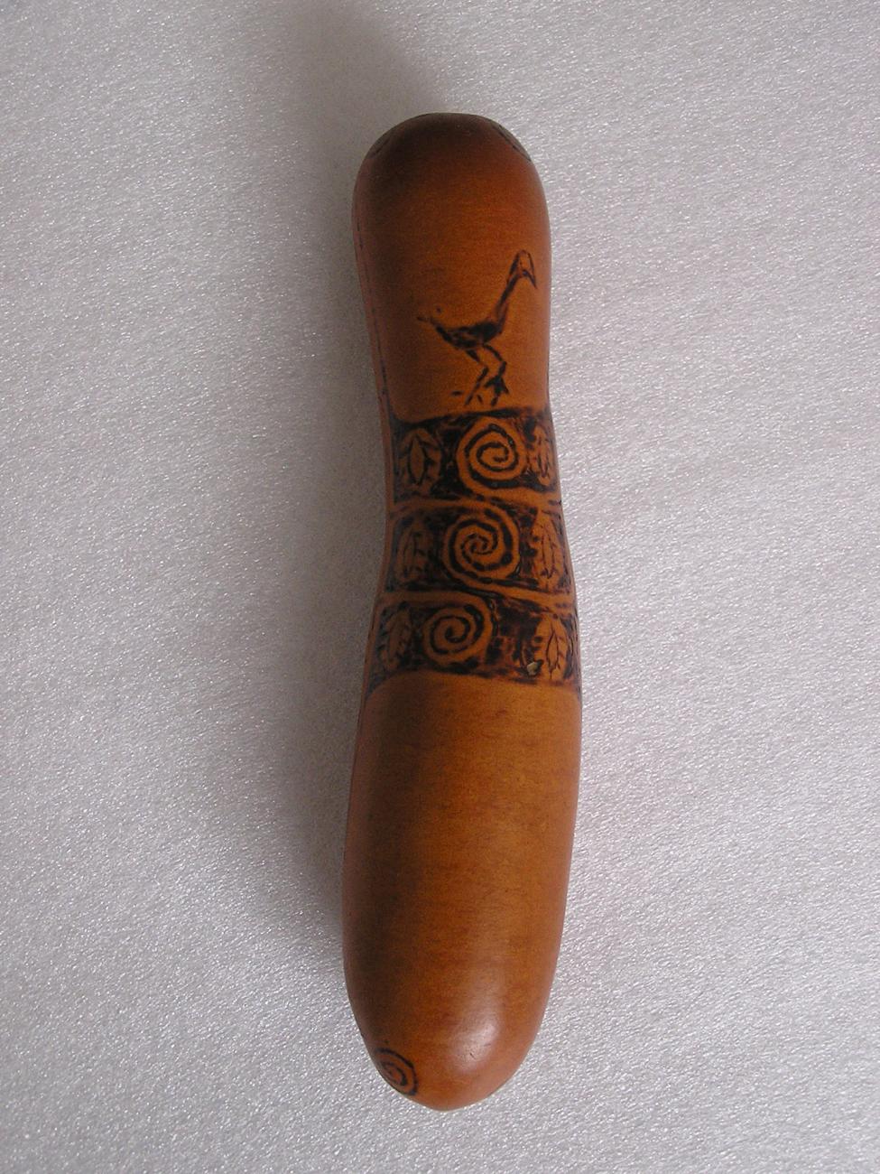Houder. Gebruikt voor het bewaren van kalk, een belangrijke ingrediënt voor de betel(sirih)pruim. Aan de bovenkant is een kleine opening voor de likstok waarmee tijdens het pruimen kalk in de mond wordt toegevoegd. (de likstok ontbreekt). De kalebas is versierd met spiraalmotieven en vogelfiguren. De versiering is in de oppervlakte van de kalebas gebrand, waardoor deze zwart gekleurd is.