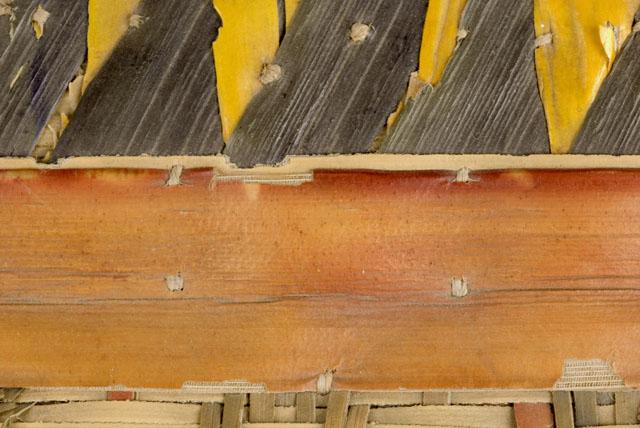 Gevlochten en gekleurd pandanusblad en orchideeënvezel. De verbindingen zijn verstevigd met extra pandanusblad en bastvezelkoord.