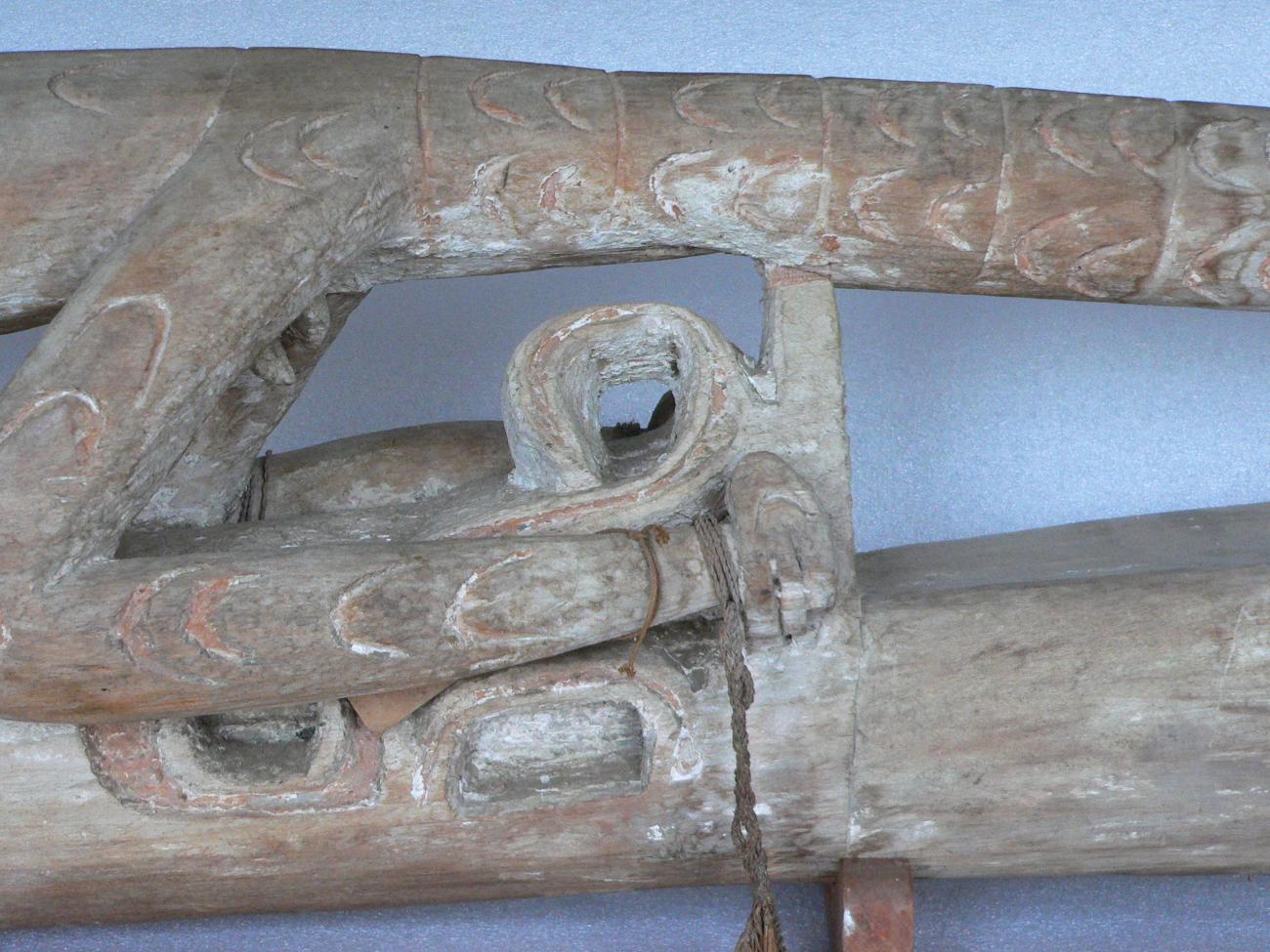 Boegstuk van een prauw, voorstellende een krokodil en gemaakt van hout.