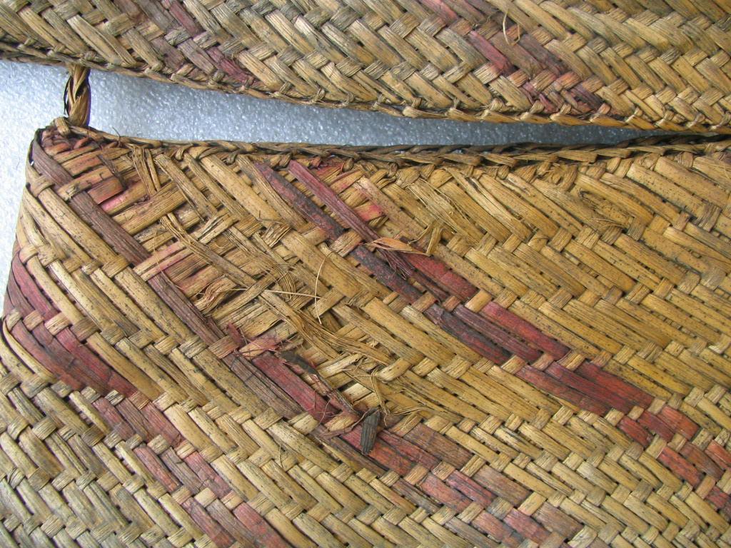 Een kleine tas voor persoonlijke bezittingen. De tas heeft een deksel dat over het onderste deel heen geschoven kan worden langs een draagkoord. De tas is gevlochten in kepervlechtwerk van biezen. De biezen zijn gedeeltelijk geverfd zo dat schuine strepen ontstaan. Het deksel en het tasgedeelte zijn beide versierd met een figuurtje van drie kaurischelpen.