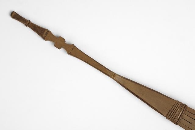 Het kamgedeelte is gemaakt door het bamboe te spitsen in 5 tanden.Tussen deze tanden zijn aan de kant van de steel plugjes tussen de tanden gestopt om ze open te houden. Vlak daarboven zijn geven kleurverschil aan dat er draad omheen heeft gezeten. Dat stevig omwonden werd om uitscheuren te voorkomen.