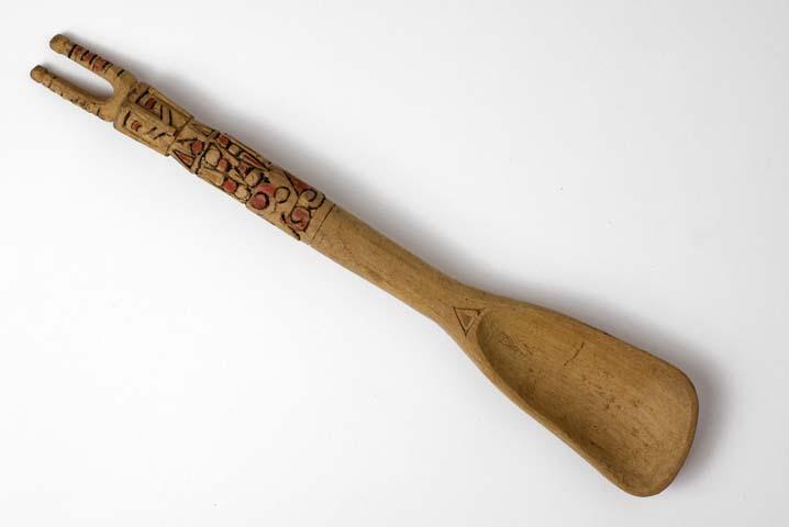 De steel is aan de top uitgesneden in de vorm van een korwarbeeldje en daaronder met reliëfhoutsnijwerk versierd. Het geheel is met rode en zwarte kleurstof verder versierd. Lengte van het lepeldeel is 8 cm.De lengte van de versiering is 11 cm. Doorsnede steel:1,5 cm.