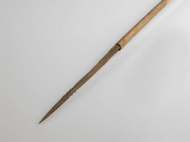 Pijl van riet met hardhouten punt. Vertoont een lichte plek, waarschijnlijk heeft versiering op gezeten. Pijlpunt is ingesneden als weerhaken. Kleur lichtbruin.Bovenstuk onderaan pijlpunt ingesneden versieringen.