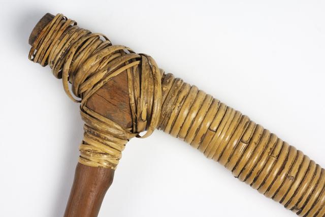 Stenen bijl. Een driekantige platgeslagen steen is met rotan aan een worteltak bevestigd. Lichtgekleurd hout. Door vrouwen gebruikt om tuintjes te bewerken. Het gedeelte van de bijl, waarin de kop bevestigd is, is omwikkeld met rotan. De bijlkop is vervaardigd van zwarte steen en gepolijst. De kling in het wortelstuk is 36 cm. Bijl is 51 cm lang.