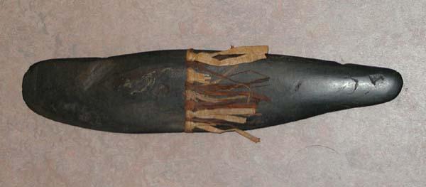Zwarte steen, voorzien van een 'rokje' van reepjes palmblad. De steen is een symbolische voorstelling van een vrouwelijke voorouder, en wordt in huis bewaard.