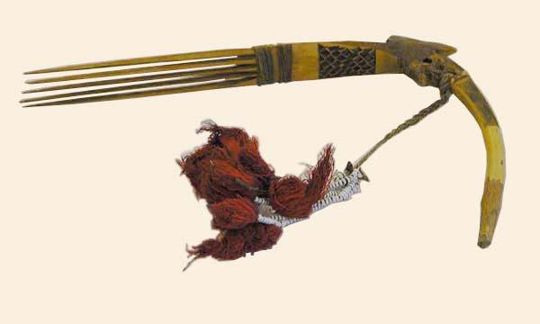 Vijfpuntige haarkam van lichtgekleurd hout. Het boveneinde is deels ajour bewerkt, deels zijn motieven ingesneden. Vermoedelijk stelt de boogvorm een gestileerde vogelkop voor. Hieraan is een gevlochten vezeldraad bevestigd met acht witte kralensnoertjes. Kwastjes van rood garen zijn hier aan vast gebonden
