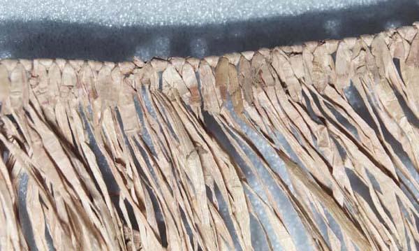 Rok vervaardigd van geplette biezen, bevestigd aan een dubbel heupkoord. De uiteinden van deze biezen zijn rood geverfd.