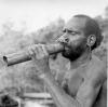 Man uit het Asmatgebied blaast op snelhoorn |