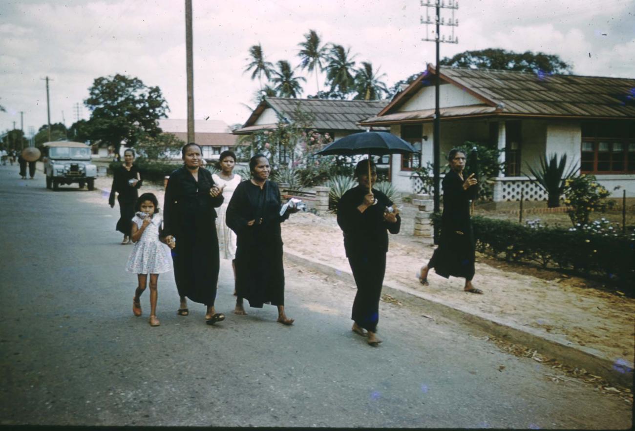 Merauke - Wandelende vrouwen en kinderen in de hoofdstraat