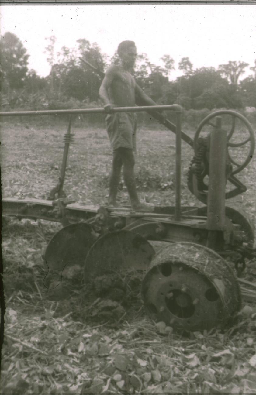 Man bewerkt de grond met een frees ten behoeve van akkerbouw