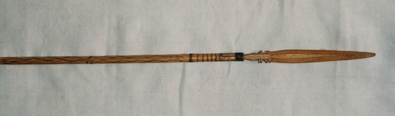 Arrow made from a tought kind of reed. with an elipse shaped point made from nibungpalm wood. The shaft has a decoration consisting of wavy lines which are burnt or carved in. At the bottom of the point several small beards are cut out.