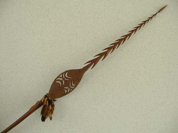 Spear made from hardwood. Towards the tip of the spear the blade has a wide part with a decoration of woodwork and a relief of spiral shapes. The spiral shapes are associated with young fearn leaves or the tail of the cuscus. The spear is also decorated with feathers and hardened reeds attached with human hair. Used in headhunting raids and today carried as an accesory when attending dance festivities.