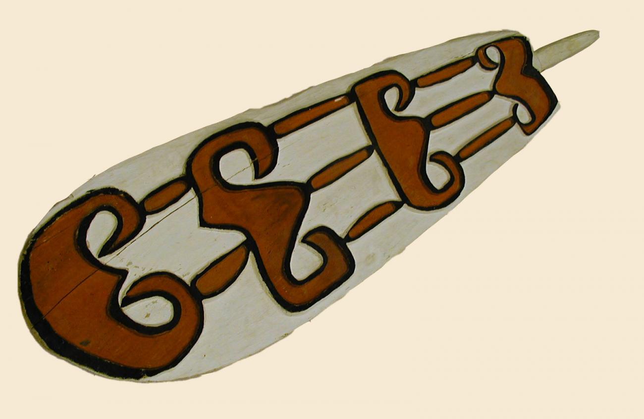 Shield decorated with typical Asmat carving. The raised outline of the figures is coloured black. The figures themselves are coloured red and the rest of the shield is coloured, probably with chalk. The back of the shield is undecorated with grip and shield carved from one piece of wood (tree root).