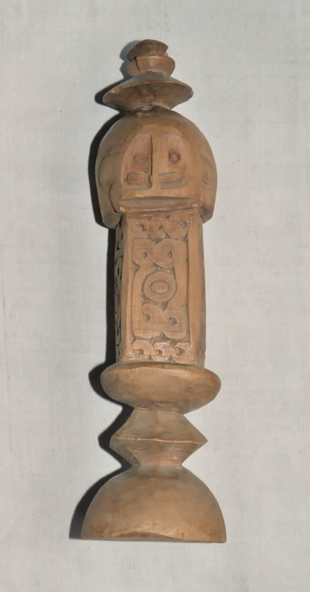 Representation of a human figure in wood, of which only the head is recognizable. The head is placed on a square center part of which the four sides are decorated with a carved vine pattern in relief. This figure is made in the Korwal style, named after the figur of Korwal. Possibly part of a larger artefact.