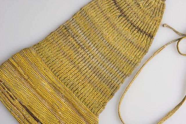 Dompet terbuat dari rajutan tali serat kulit kayu dihiasi dengan lajur-lajur horizontal terbuat dari serat (mungkin asal anggrek) berwarna cokelat dan kuning. Sampulnya meruncing sampai menjadi tali penutup