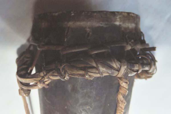 Gendang terbuat dari kayu berwarna gelap tanpa dekorasi. Tutup gendang terbuat dari kulit anjing yang terpasang dengan lingkaran rotan yang dapat ditegangkan.