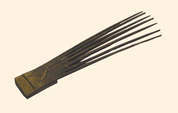 Sisir bergigi lima terbuat dari kayu berwarna muda. Jarak antara ke lima gigi agak lebar. Di bagian pegangannya terdapat semacam sambungan terbuat dari kayu yang dikaitkan ke sebuah sisir lebih kecil hampir serupa tetapi bergigi tujuh terbuat dari kayu .