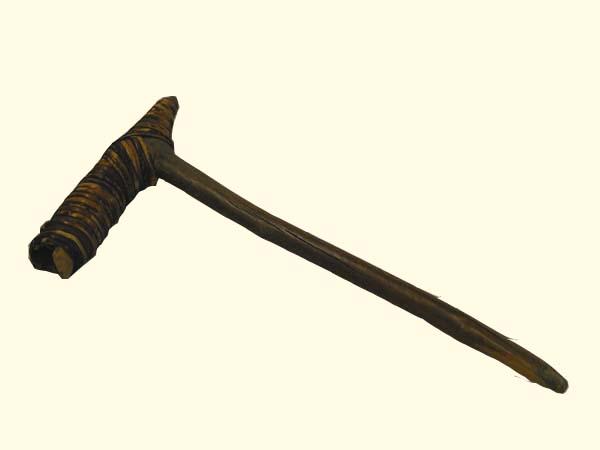 Sendok bertangkai tipis terbuat dari kayu berwarna mudah. Tangkai sendok ditusuk melalui separoh belahan batok kelapa yang dirongrong dengan tepinya bergerigi. Mungkin digunakan pada proses pembuatan sago