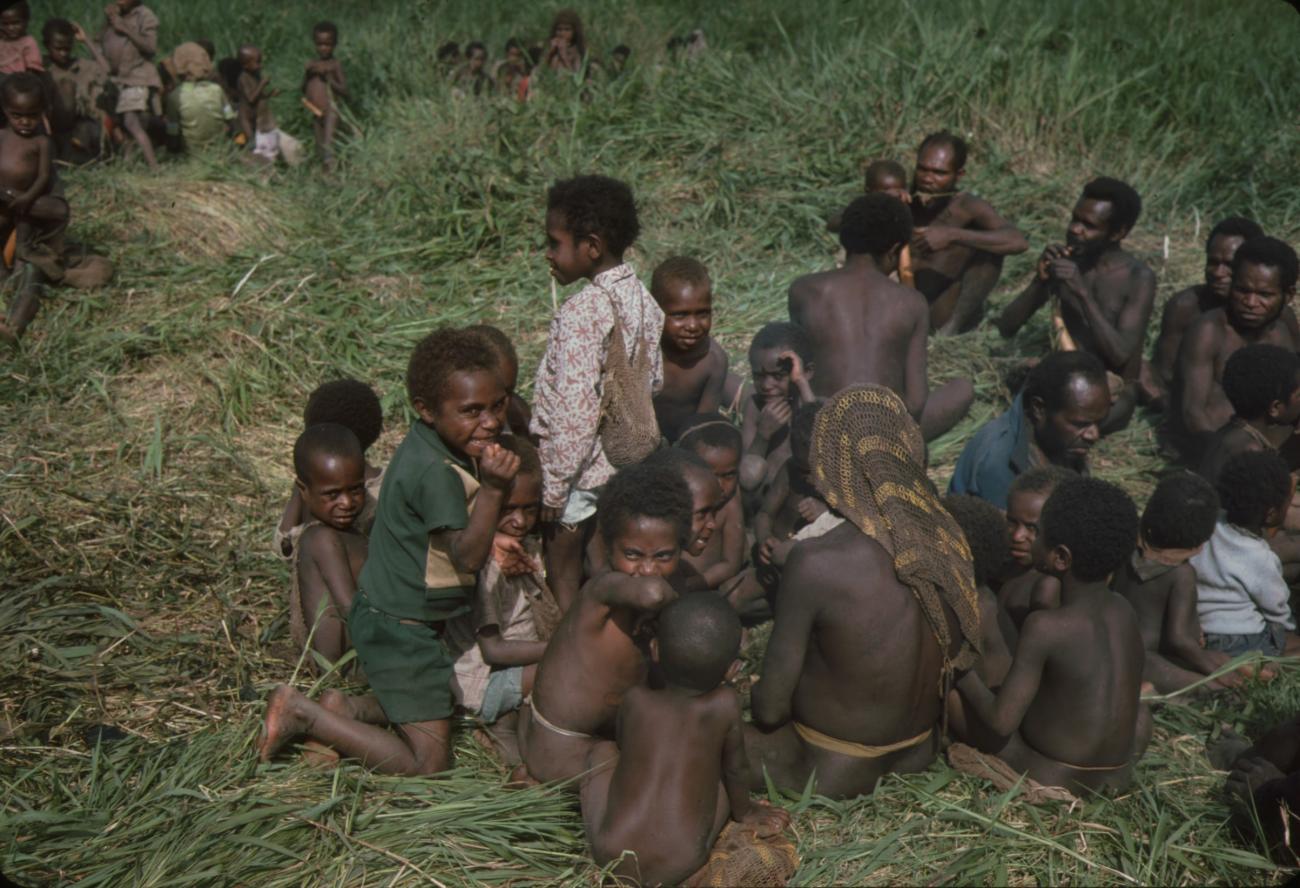 groep mannen en kinderen in het gras