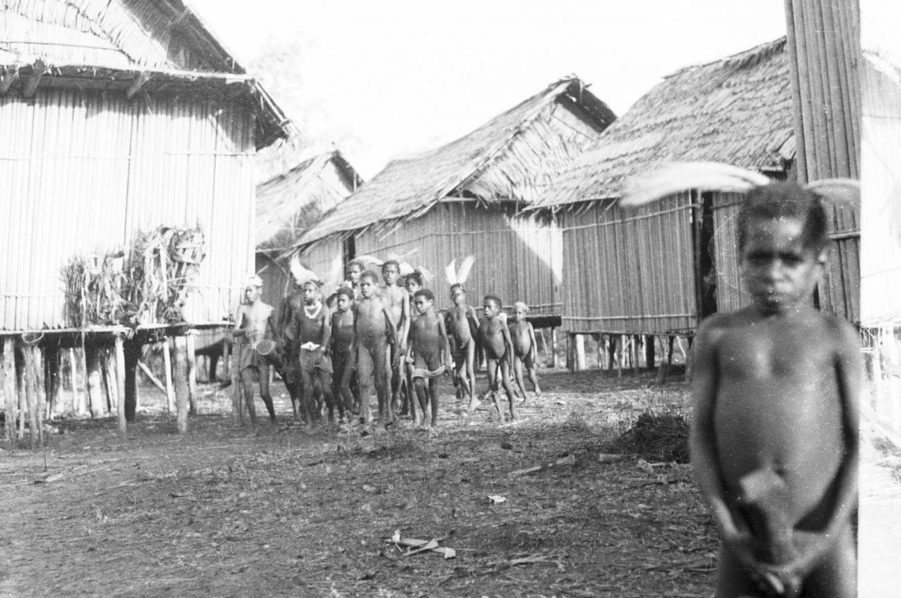 Tocht Merauke-Kepi-Cookrivier vv: Portret van een jongen met paradijsvogelveren als hoofdsieraad en bamboekoker in zijn handen, met dorpsbewoners op achtergrond